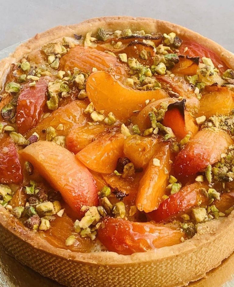 Étaler une fine couche de confiture sur le fond de tarte, recouvrir de crème d’amande puis disposer les fruits.